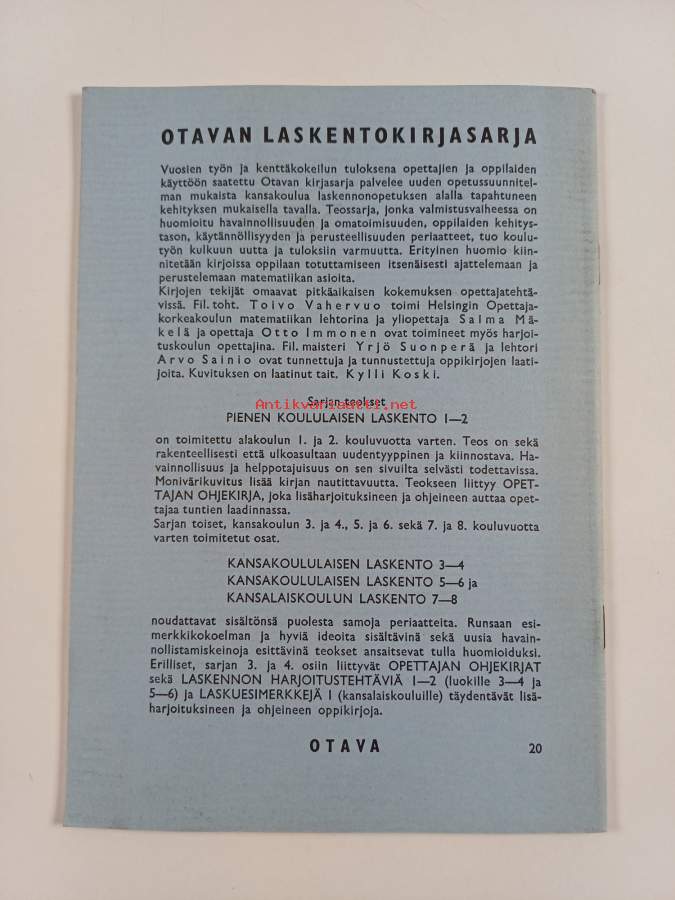 Muu(t) tekijä(t): Saima Mäkelä, Otto ImmonenSarja: Kansakoululaisen laskento 3 ja 4Asiasanat: matematiikka, kansakoulu, matematik, folkskolan