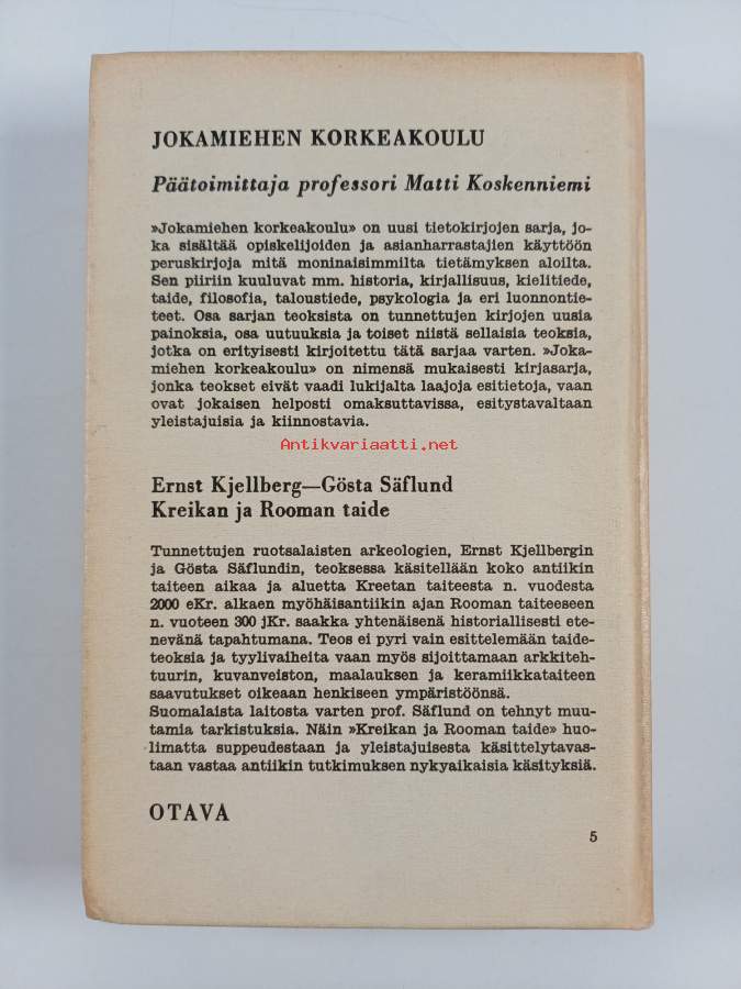 Muu(t) tekijä(t): Olli Valkonen, Gösta SäflundMerkinnät: exlibris: Aarne ValleSarja: Jokamiehen korkeakoulu 9Alkuteos: Grekisk och romersk konstAsiasanat: antiikki, taide, kuvataide, taidehistoria, etruskit, aigeialainen taide