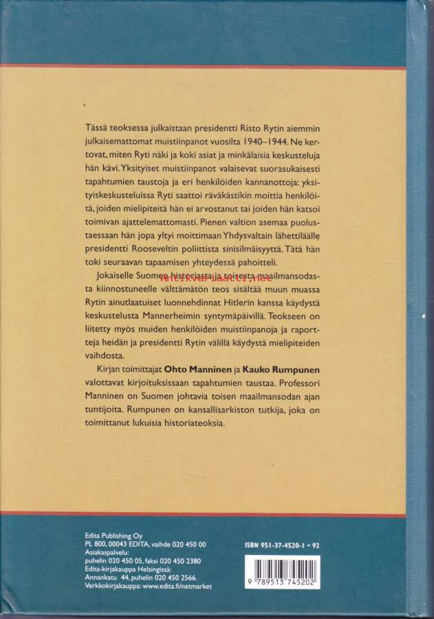 "Käymme omaa erillistä sotammee". Risto Rytin päiväkirjat 1940-1944.