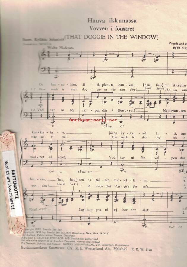 Hauva ikkunassa - Doggie in the window - Vovven i fönstret -nuotit / notes