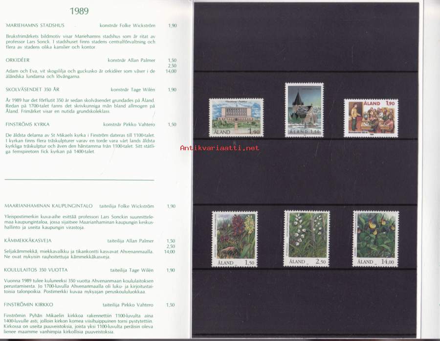 Åländska frimärken 1989 – Ahvenanmaan vuosilajitelma. Postimerkit postituoreina ** mukana myös kaikki 4 FDC‑kuorta.(LAPE FDC 19€, merkit 10€) (filatelia)