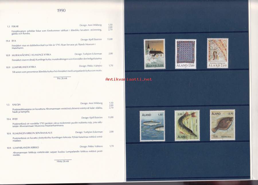 Åländska frimärken 1990 – Ahvenanmaan vuosilajitelma. Postimerkit postituoreina ** mukana myös kaikki 4 FDC‑kuorta.(LAPE FDC 15€, merkit 10€) (filatelia)