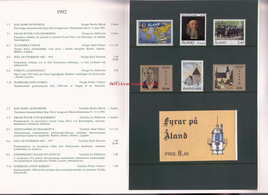 Åländska frimärken 1992 – Ahvenanmaan vuosilajitelma. Postimerkit postituoreina ** mukana myös 3 FDC‑kuorta.(LAPE FDC 7€, merkit 20€) (filatelia)