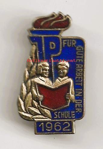 Itä-Saksan (DDR) aikainen rintamerkki, joka on myönnetty hyvästä koulumenestyksestä vuonna 1962. Nimi: Merkki hyvästä työstä koulussa ("Für gute Arbeit in der Schule").