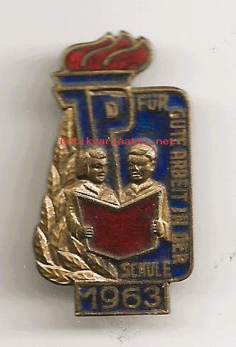 Itä-Saksan (DDR) aikainen rintamerkki, joka on myönnetty hyvästä koulumenestyksestä vuonna 1963. Nimi: Merkki hyvästä työstä koulussa ("Für gute Arbeit in der Schule").