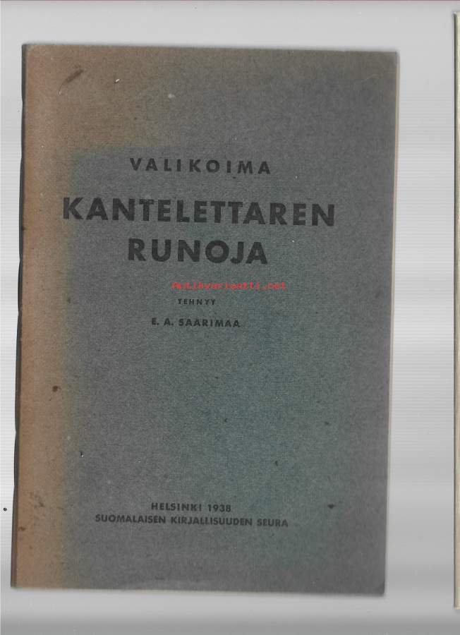 E. A. Saarimaan toimittama ja Suomalaisen Kirjallisuuden Seuran vuonna 1938 julkaisema teos Valikoima Kantelettaren runoja. Kyseessä on suomalaisen kansanrunouden klassikkoteoksen valikoima.Teos sisältää runoja Kantelettaresta, joka on yksi keskeisimmistä suomalaisista kansanrunokokoelmista.KäännösVALIKOΙΜΑ: ValikoimaKANTELETTAREN RUNOJA: Kantelettaren runojaTEHNYT: TehnytB. A. SAARIMAA: E. A. SaarimaaHELSINKI 1938: Helsinki 1938SUOMALAISEN KIRJALLISUUDEN SEURA: Suomalaisen Kirjallisuuden Seura