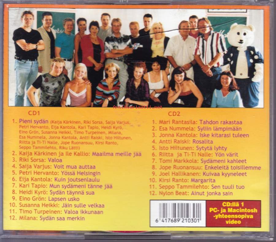 **1-1 Kaija Kärkinen, Riki Sorsa, Saija Varjus, Petri Hervanto, Eija Kantola, Kari Tapio, Heidi Kyrö, Eino Grön, Susanna Heikki, Timo Turpeinen, Milana*, Esa Nummela, Jonna Kantola, Antti Raiski, Isto Hiltunen, Riitta* Ja Ti-Ti Nalle, Jope Ruonansuu, Kirsi Ranto, Seppo Tammilehto, Riku Lätti (2)– Pieni Sydän3:09*1-2 Kaija Kärkinen Ja Ile Kallio– Maailma Meille Jää4:45*1-3 Riki Sorsa– Valoa4:12*1-4 Saija Varjus– Voit Mua Auttaa3:40*1-5 Petri Hervanto– Yössä Helsingin3:17*1-6 Eija Kantola– Kuin Joutsenlaulu3:30*1-7 Kari Tapio– Mun Sydämeni Tänne Jää2:57*1-8 Heidi Kyrö– Sydän Täynnä Sua3:33*1-9 Eino Grön– Lapsen Usko3:17*1-10 Susanna Heikki– Jäin Sulle Velkaa3:39*1-11 Timo Turpeinen– Valoa Ikkunaan3:20*1-12 Milana*– Sydän Saa Merkin3:58*Video Kaija Kärkinen, Riki Sorsa, Saija Varjus, Petri Hervanto, Eija Kantola, Kari Tapio, Heidi Kyrö, Eino Grön, Susanna Heikki, Timo Turpeinen, Milana*, Esa Nummela, Jonna Kantola, Antti Raiski, Isto Hiltunen, Riitta* Ja Ti-Ti Nalle, Jope Ruonansuu, Kirsi Ranto, Seppo Tammilehto, Riku Lätti (2)– Pieni Sydän 3:10*2-1 Mari Rantasila– Tahdon Rakastaa3:47*2-2 Esa Nummela– Syliin Lämpimään3:45*2-3 Jonna Kantola– Iske Kitarasi Tuleen2:48*2-4 Antti Raiski– Rosalita2:47*2-5 Isto Hiltunen– Sytytä Lyhty3:26*2-6 Riitta* Ja Ti-Ti Nalle– Yön Värit2:54*2-7 Tomi Markkola– Sydämeni Kahleet3:40*2-8 Jope Ruonansuu– Enkeleitä Toisillemme3:52*2-9 Joel Hallikainen– Kuivaa Kyyneleet3:20*2-10 Kirsi Ranto– Margarita3:10*-11 Seppo Tammilehto– Sen Tuuli Tuo3:56*2-12 Nylon Beat– Ainut Jonka Sain4:02