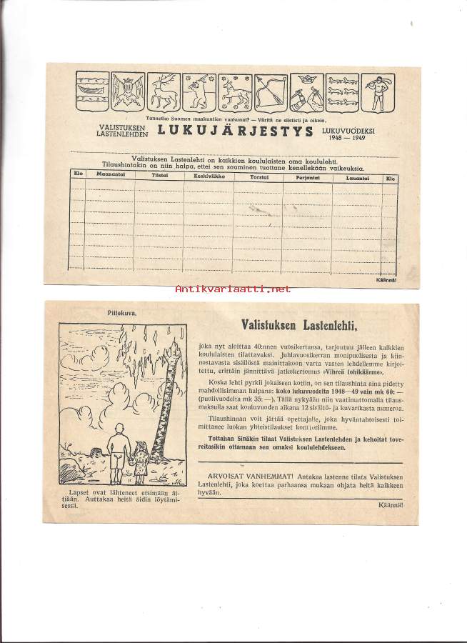 Valistuksen lastenlehti lukujärjestys lukuvuosi 1948 - 1949 täyttämätön