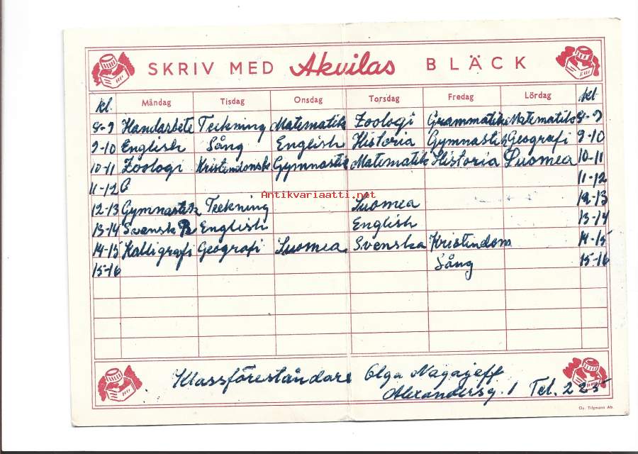 Akvilas Läsorning lukujärjestys täytetty 1939