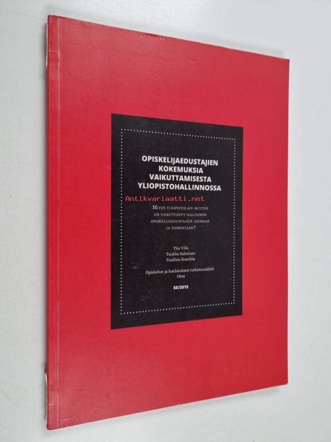 Koko nimi: Opiskelijaedustajien kokemuksia vaikuttamisesta yliopistohallinnossa : miten yliopistolain muutos on vaikuttanut hallinnon opiskelijaedustajien asemaan ja toimintaan?Muu(t) tekijä(t): Tuukka Salminen, Pauliina KoschkeSarja: Otus-julkaisuja 50/2015Asiasanat: kokemukset, vaikuttaminen, yliopistot, opiskelijat, hallinto, hallintoelimet, yliopistolaki, erfarenheter, universitet, studerande, påverkan, förvaltning, förvaltningsorgan, universitetslag