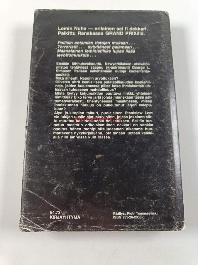 Hyvä. Pienoista kolhua, hieman kulumaa, pienoista tahraisuutta, selkämyksessä hieman vinoutta. Kansipaperin kunto: joitain repeämiä/kulumaa