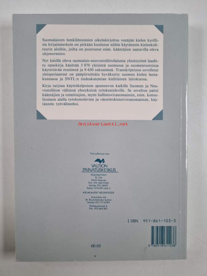 Suomalaisten henkilönnimien kyrillinen siirrekirjainnusopas = Spravocnik po russkoj peredace finljandskih licnyh imen i familij