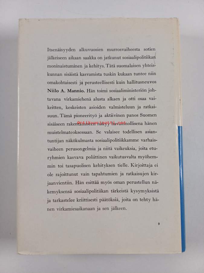 Sosiaalipoliitikon kokemuksia 50 itsenäisyysvuoden ajaltaKirjaHenkilö Mannio, Niilo A., 1884-1968 ; Henkilö Mannio, Niilo A., 1884-1968WS 1967