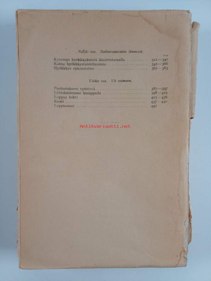 Huonokuntoinen (lukukelpoinen). Jonkin verran repeämää selkämyksessä, selkämyksessä aavistus vinoutta. etukannen ja muutaman ensimmäisen sivun yläreunassa jonkin verran läikkää ; takakansi puuttuu