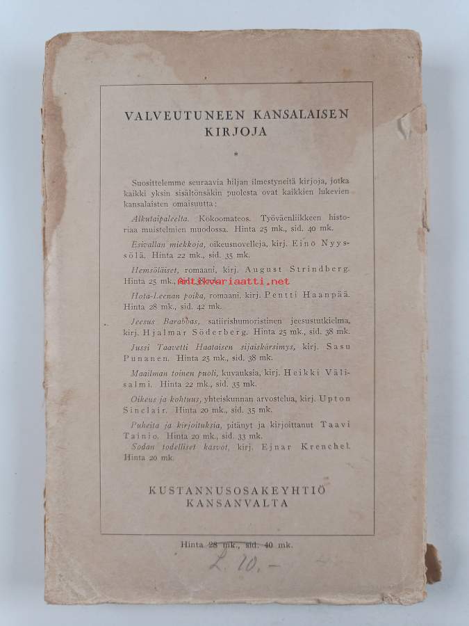 Tyydyttävä. Tarkempi kuntoluokka: K2- ; Jonkin verran repeämää selkämyksessä, jonkin verran tahraisuutta kansissa, selkämyksessä aavistus vinoutta. kansien ja sivujen reunoilla hieman läikkää