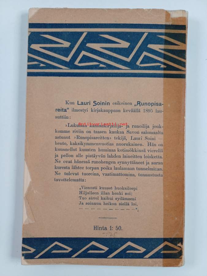 Tyydyttävä. Tarkempi kuntoluokka: K2- ; Jonkin verran repeämää reunoilla ja kulmissa, selkämyksessä hieman vinoutta. kirjan kulmista puuttuu palaset ; selkämystä teipattu
