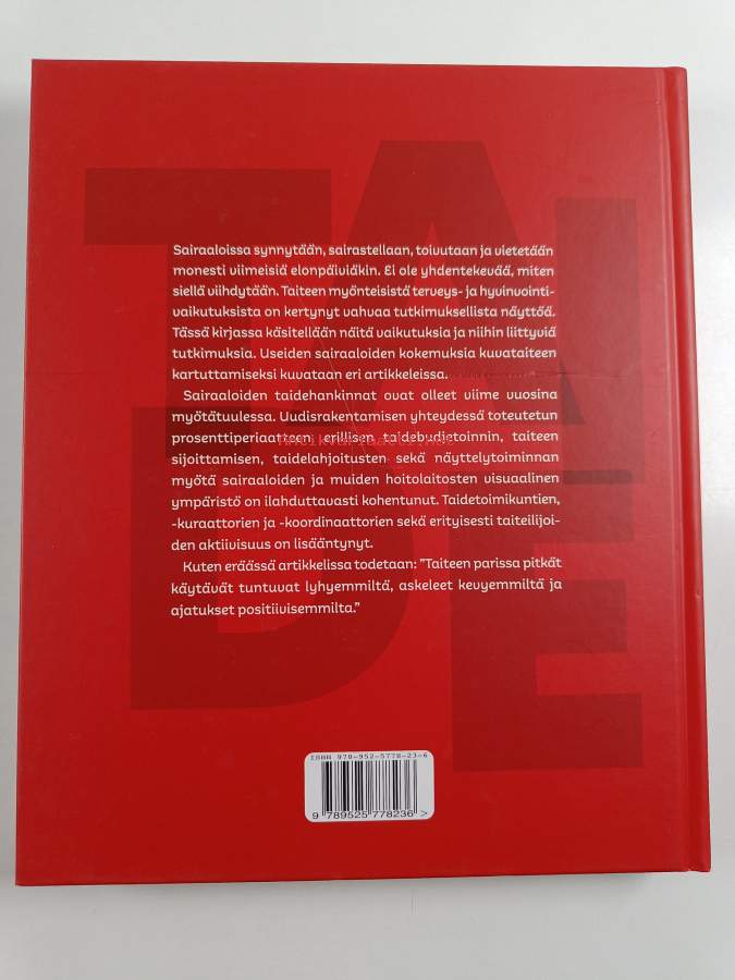 Muu(t) tekijä(t): Ilkka Taipale, Don McCracken ym.Asiasanat: historia, terveysvaikutukset, kuvataiteilijat, säätiöt, taide, kuvataide, hyvinvointi, taideteokset, taidekokoelmat, kokoelmat, taiteen tukeminen, toipuminen, potilaat, hoitolaitokset, kulttuuritoiminta, sairaalat, estetiikka, hankinta, nykytaide, sijoitus, merkitykset (semantiikka), prosenttitaide, hoitoympäristö, taidepsykologia, taidekokemukset