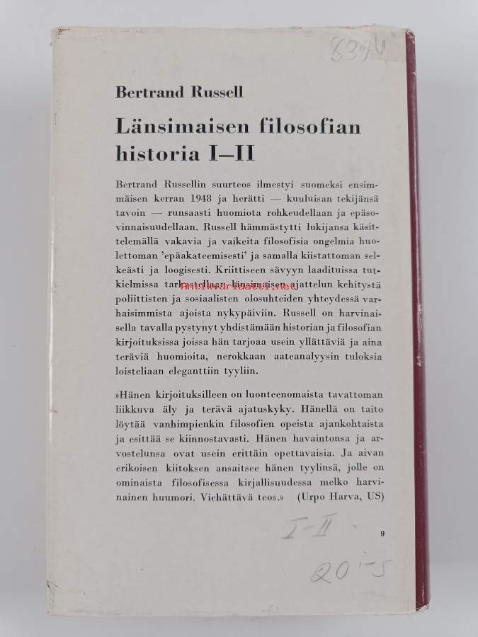Koko nimi: Länsimaisen filosofian historia 1 : Poliittisten ja sosiaalisten olosuhteiden yhteydessä varhaisimmista ajoista nykyaikaan asti : Vanhan ajan filosofia ; Katolinen filosofiaMuu(t) tekijä(t): J. A. HolloSarja: Länsimaisen filosofian historia 1 : 1; Poliittisten ja sosiaalisten olosuhteiden yhteydessä varhaisimmista ajoista nykyaikaan astiAlkuteos: History of western philosophy - and its Connection with Political and Social Circumstances from the Earliest Times to the Present Day