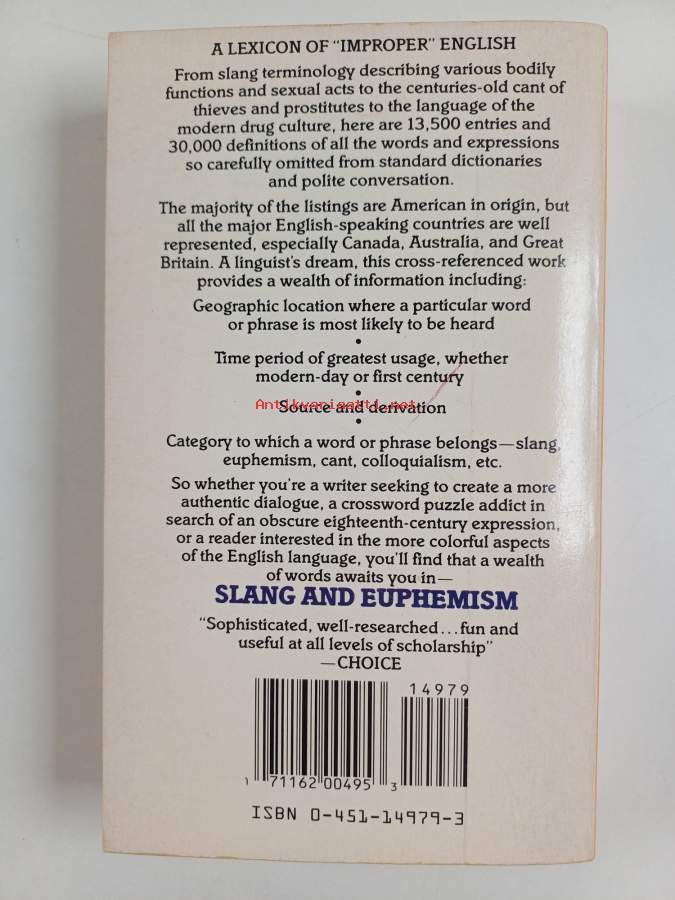 Slang and Euphemism - A Dictionary of Oaths, Curses, Insults, Sexual Slang and Metaphor, Racial Slurs, Drug Talk, Homosexual Lingo, and Related Matters