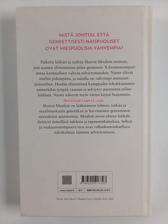 Muu(t) tekijä(t): Anna KangasmaaAlkuteos: The better halfAsiasanat: taudit, naiset, terveys, hyvinvointi, perinnöllisyys, sukupuolierot, sairaus, geenit, perinnöllisyystiede, perinnöllisyyslääketiede, kromosomit