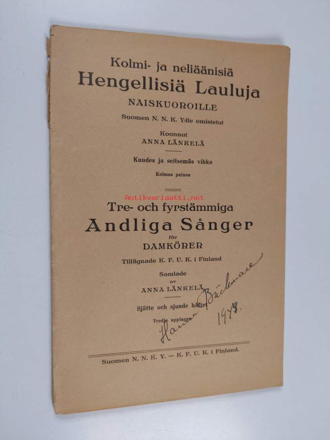 Kolmi- ja neliäänisiä Hengellisiä laukuja naiskuoroille NNKY nuottipainos yht 2 kpl