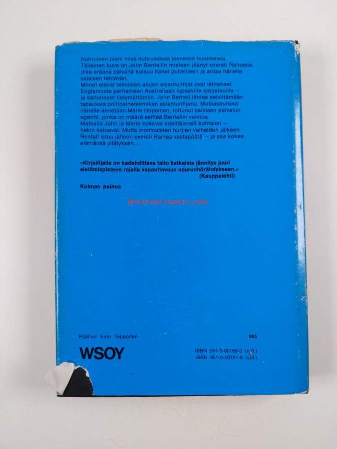 Hyvä. Pientä käytön jälkeä kansissa, selkämyksessä hieman vinoutta. Kansipaperin kunto: jonkin verran kulumaa/pienoisia repeämiä