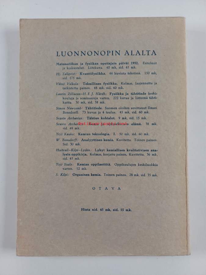 Lyhyt luonnonopin oppikirja keskikoulua varten, 1917. Sisältäen fysiikan, tähtitieteen ja kemian alkeita.