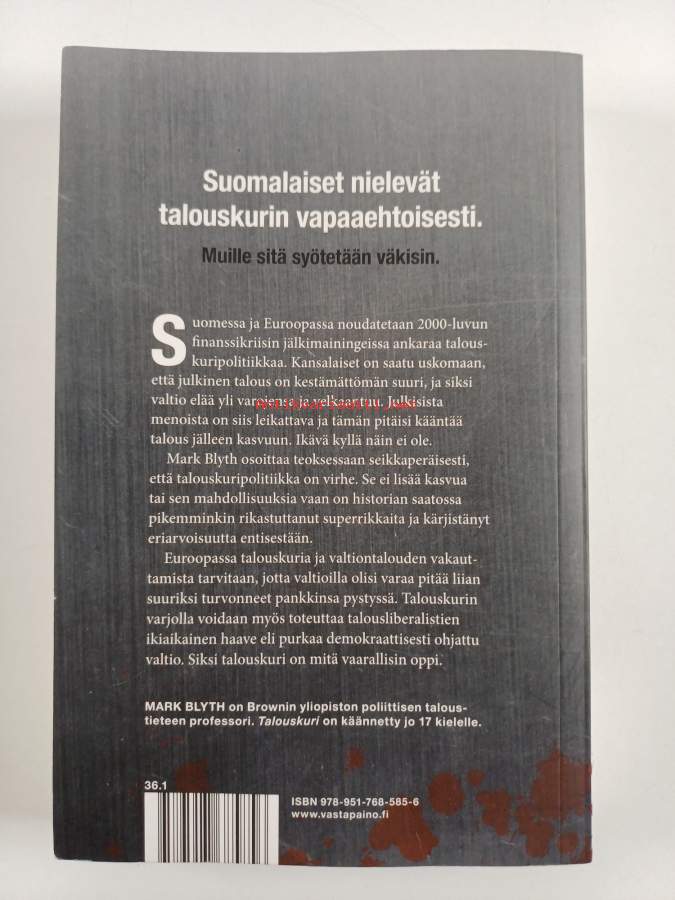 Muu(t) tekijä(t): Hannu LaurilaAlkuteos: AusterityAsiasanat: talouspolitiikka, taloushistoria, suhdannevaihtelut, Suomi, valtiontalous, markkinatalous, taloudellinen sääntely, velkaantuminen, talousteoriat, yksityinen sektori, taloudelliset vaikutukset, julkinen talous, poliittinen taloustiede, finanssikriisit, julkiset menot, menoleikkaukset