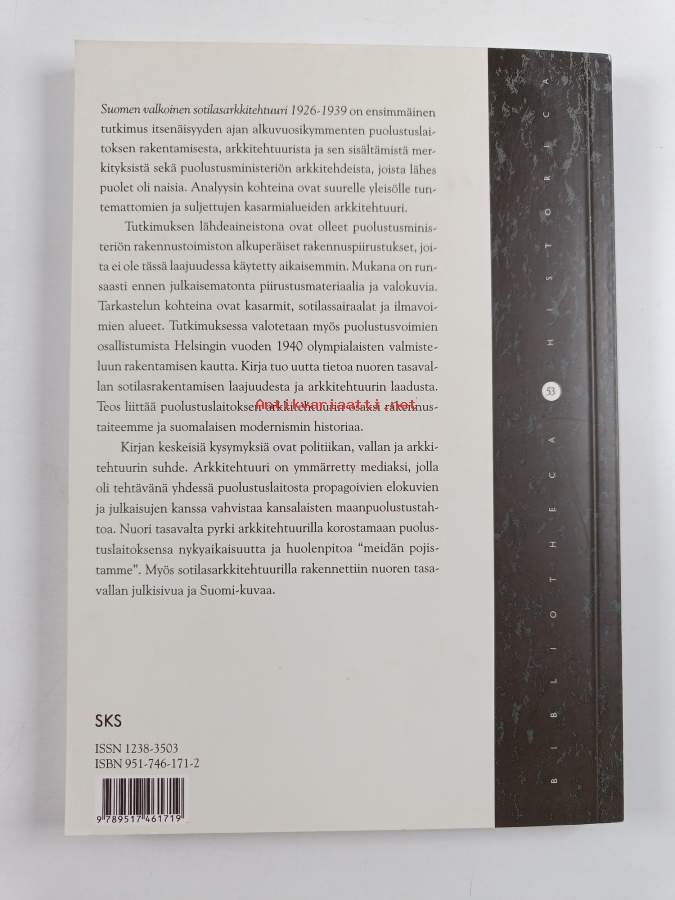 Sarja: Bibliotheca historica 53Asiasanat: historia, arkkitehtuuri, puolustusvoimat, politiikka, rakennukset, imago, nationalismi, isänmaallisuus, kasarmit, sotilassairaalat, 1930-luku, 1920-luku
