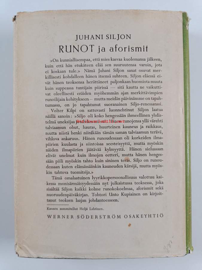 Hyvä. Hieman kolhua selkämyksen päissä, hieman kulumaa, selkämyksessä hieman vinoutta. Kansipaperin kunto: repeämiä/kulumaa