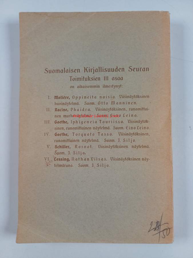Hyvä. Hieman rispaantumaa selkämyksen päissä, hieman kulumaa, selkämyksessä hieman vinoutta, selkämyksessä lukutaittumaa