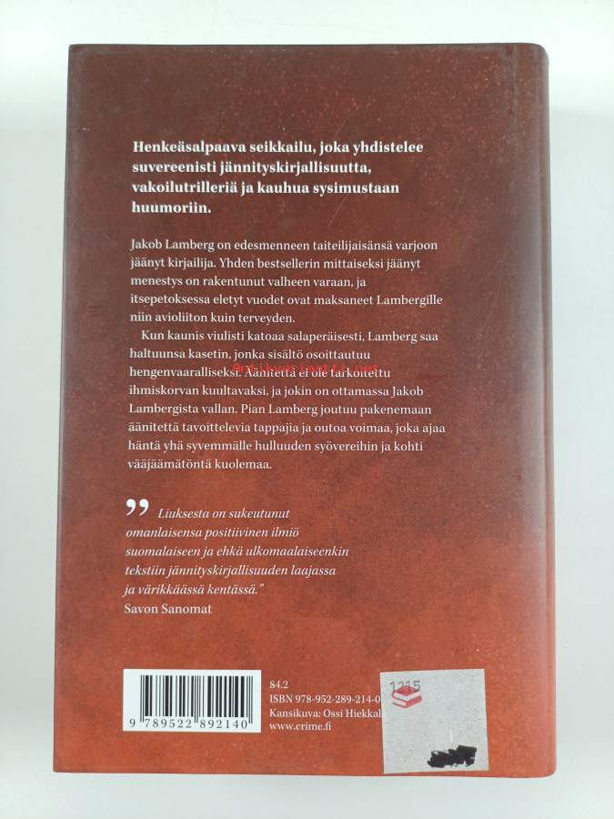 Hyvä. Tarkempi kuntoluokka: K3+ ; Pienoista kulumaa kansissa, pienoista kolhua reunoilla ja kulmissa, takana vanha hintalappu. Kansipaperin kunto: repeämiä/kulumaa