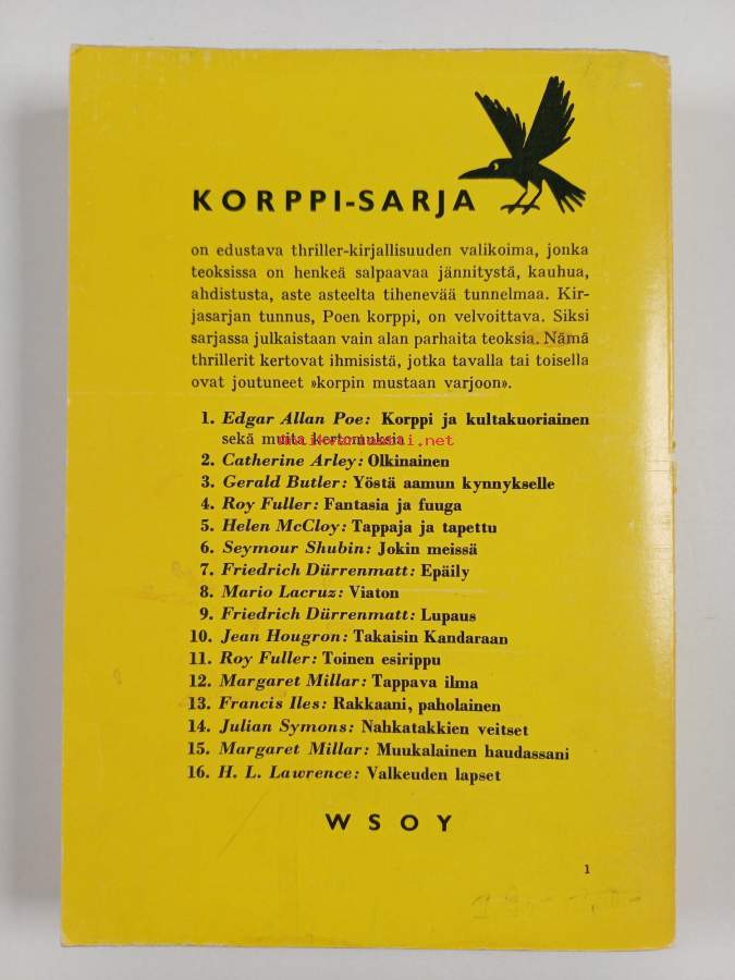 Hyvä. Tarkempi kuntoluokka: K3- ; Hieman kulumaa kansissa, hieman tahraisuutta takakannessa, selkämyksessä hieman vinoutta, selkämyksessä lukutaittumaa