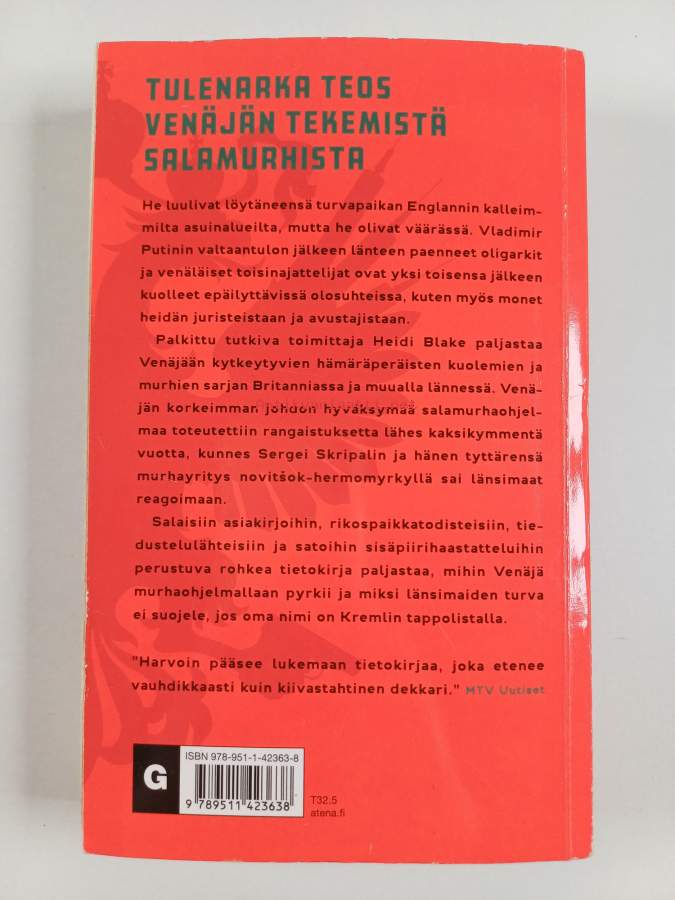 Muu(t) tekijä(t): Aura NurmiAlkuteos: From Russia with bloodAsiasanat: poliittinen historia, presidentit, toisinajattelijat, turvallisuuspalvelut, venäläiset, vallankäyttö, vakoilijat, poliittinen väkivalta, poliittinen murha, maanpako, salamurha, oligarkit
