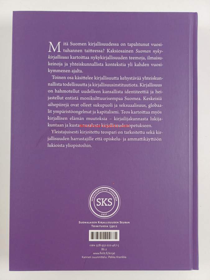 Muu(t) tekijä(t): Leena Kirstinä, Yrjö Hosiaisluoma ym.Sarja: Suomen nykykirjallisuus 2; Suomalaisen Kirjallisuuden Seuran toimituksia 1390:2Asiasanat: kirjallisuudentutkimus, kirjallisuudenhistoria, kirjailijat, kansainvälistyminen, kulttuuripolitiikka, kirjallisuus, monikulttuurisuus, yhteiskuntakritiikki, sukupuoli, kustannusala, julkisuus, sananvapaus, kirjallisuuskritiikki, lukeminen, kirjakaupat, kirjallisuuspalkinnot, kirjallisuuslehdet, kirjallinen kulttuuri, kirjastolaitos, ekokritiikki