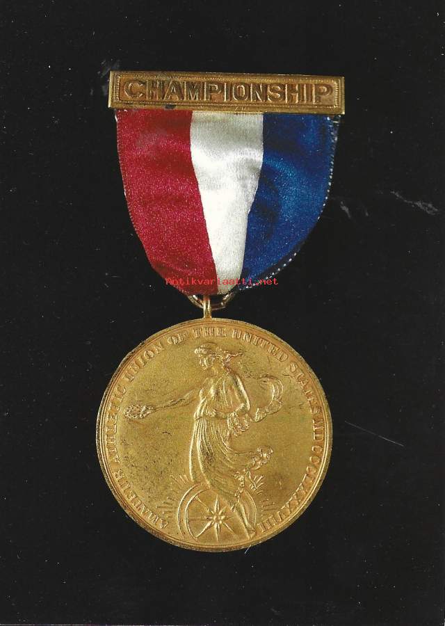 Amateur Athletic Union (AAU) -liiton kultainen mestaruusmitali, Paavo Nurmi voitti Yhdysvaltain kiertueellaan vuonna 1925. postikortti kulkematon kohopaino