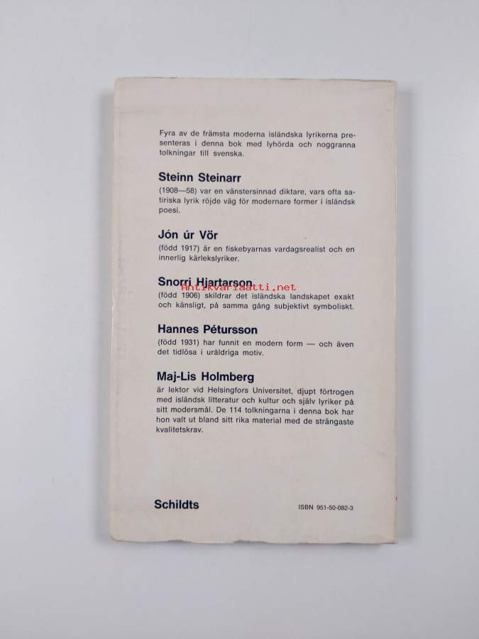 Mellan fjäll och hav. Modern isländsk lyrik av Stein Steinarr, Jón úr Vör, Snorri Hjartarson, Hannes Pétursson / i svensk tolkning av Maj-Lis Holmberg