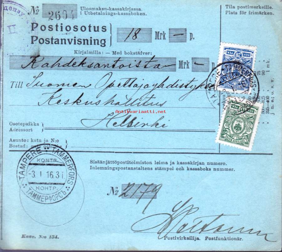 Filatelia Suomi - Postiosoitus - 3.1.1916 (1x 20p sininen, 1x 5p vihreä)
