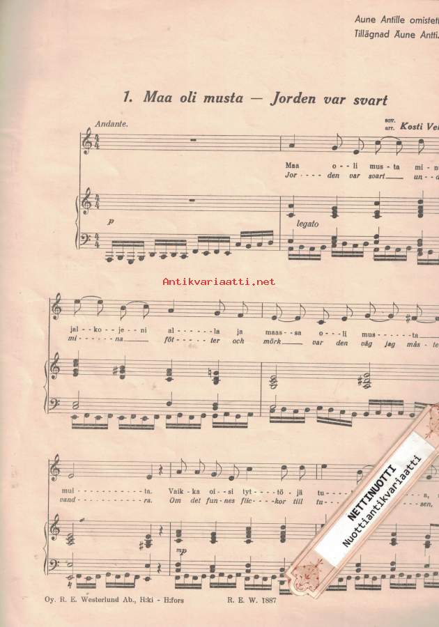 Laululle ja pianolle, för sång och piano, sovittanut Kosti Vehanen, Sanat ja sävelmän merkinnyt muistiin Lyyli Vartiovaara-Kallioniemi.1. Maa on niin musta 2. Kullannuppu 3. Poikain polku 4. Surussa 5. Nirunarukengät 6. Mökin poika