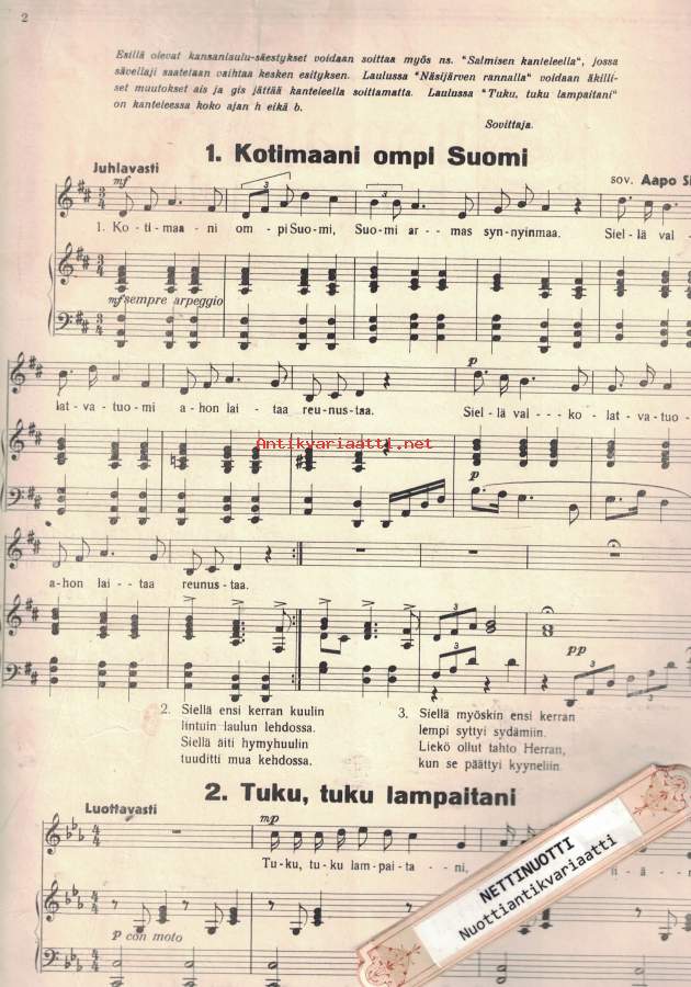 1. Kotimaani ompi Suomi 1. Tuku, tuku lampaitani 3. Näsijärven rannalla 4. Kannel 5. Peräkorven Jukka 6. Käkönen se kukkuu- Postipaketti