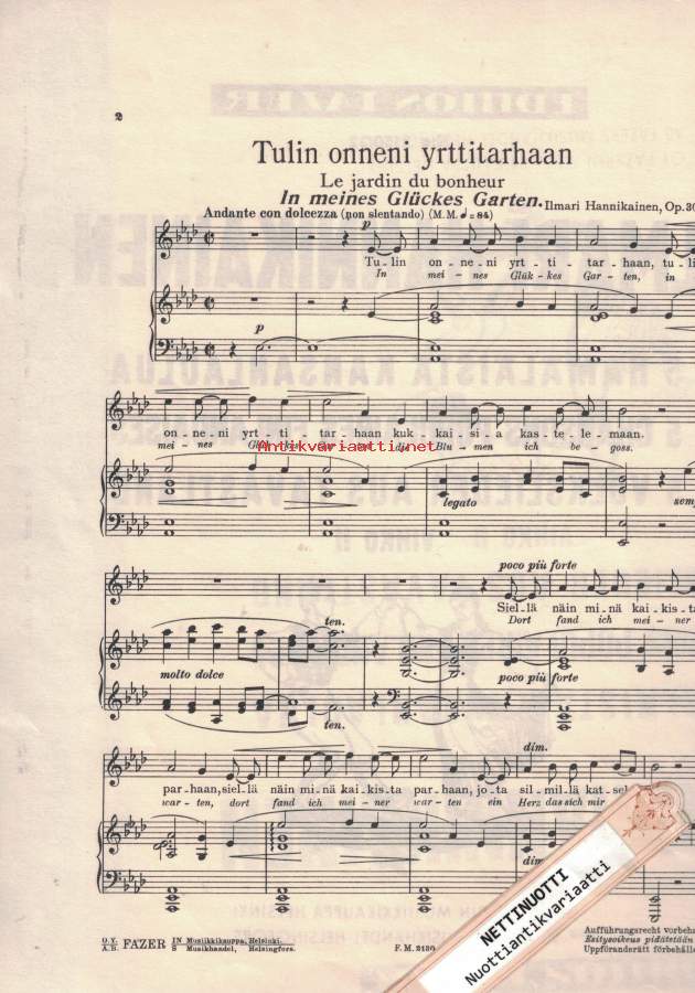 1 Tulin onneni yrttitarhaan = Le jardin du bonheur = In meines Glückes Garten2 Kun minä kotoani läksin = Loin du pays = Seit ich die Heimat musste lassen3 Tanssilaulu II = Ronde II = Tanzlied II- Suuri Helposti kuori