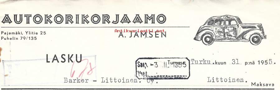Autokorjaamo Jämsen Turku 1955 firmalomake