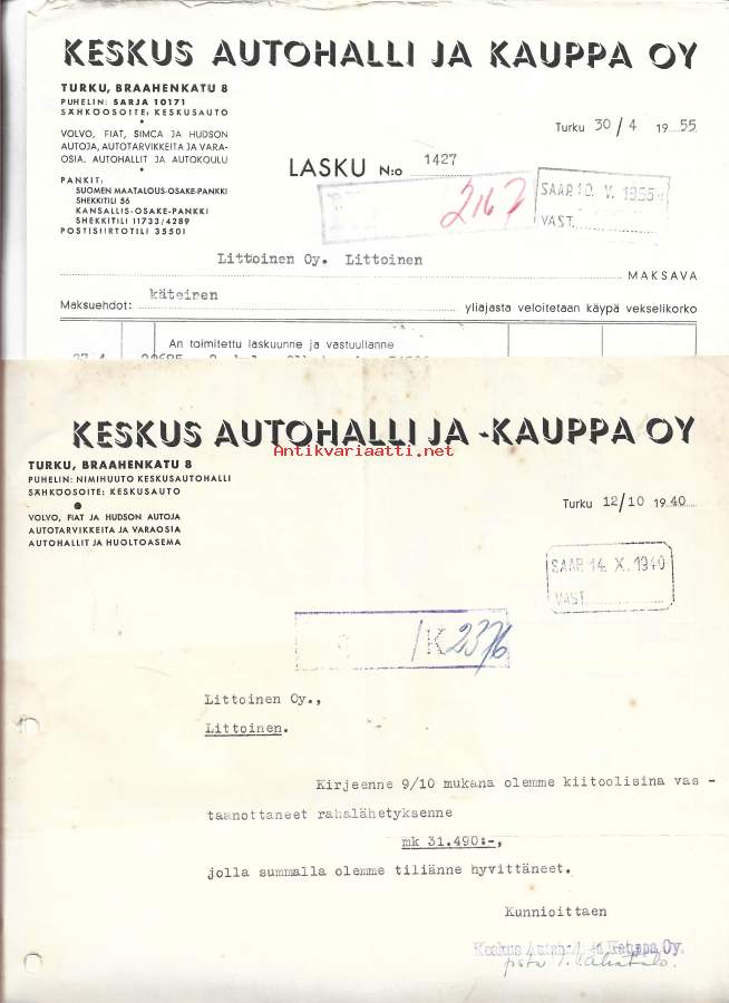 Turun Autohalli ja Kauppa Oy Turku 1940, -55 firmalomake 2 eril