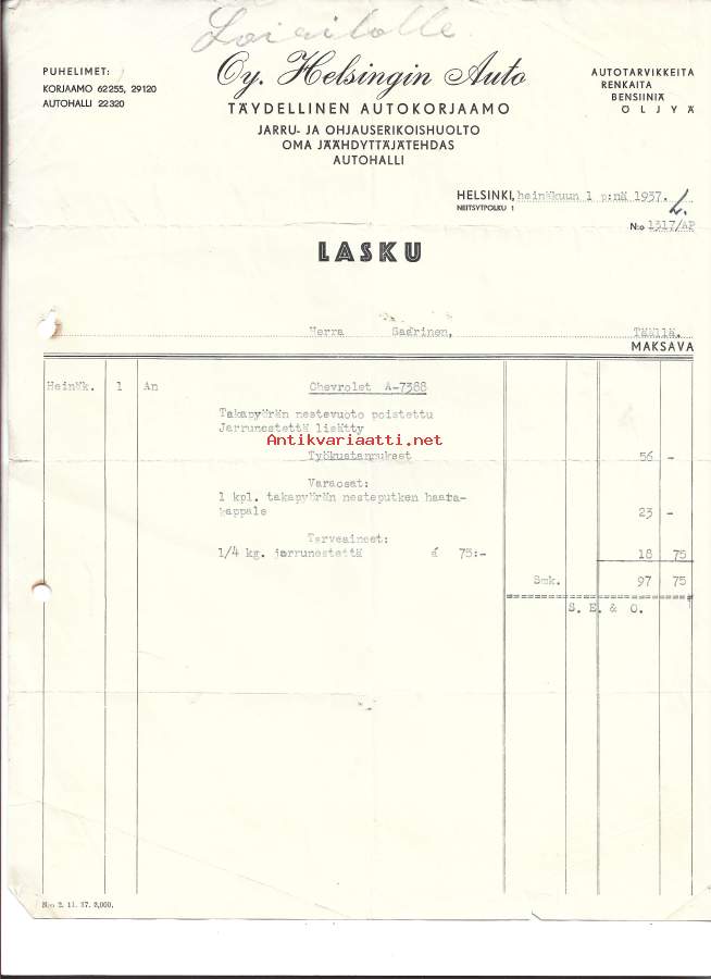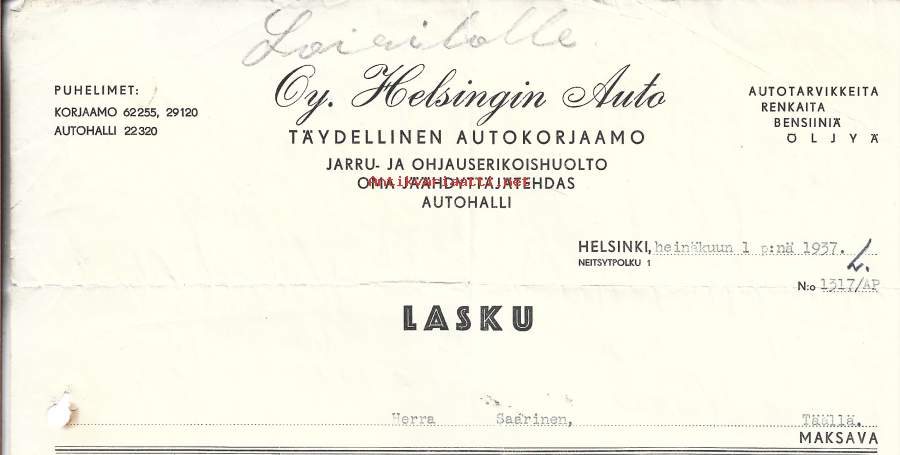 Helsingin Auto O Helsinki 1937 firmalomake