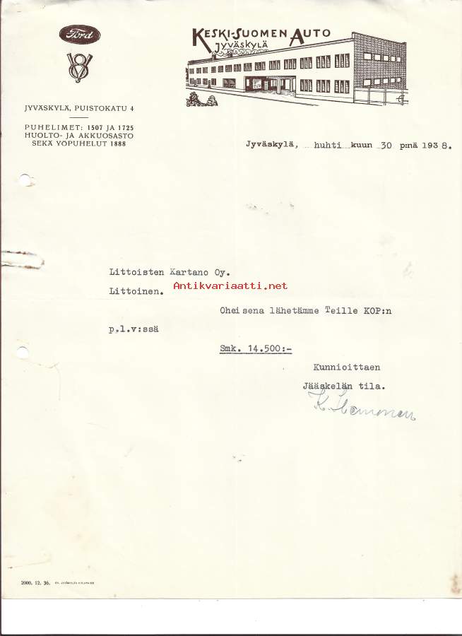 Keski-Suomen Auto Jyväskylä 1938 firmalomake
