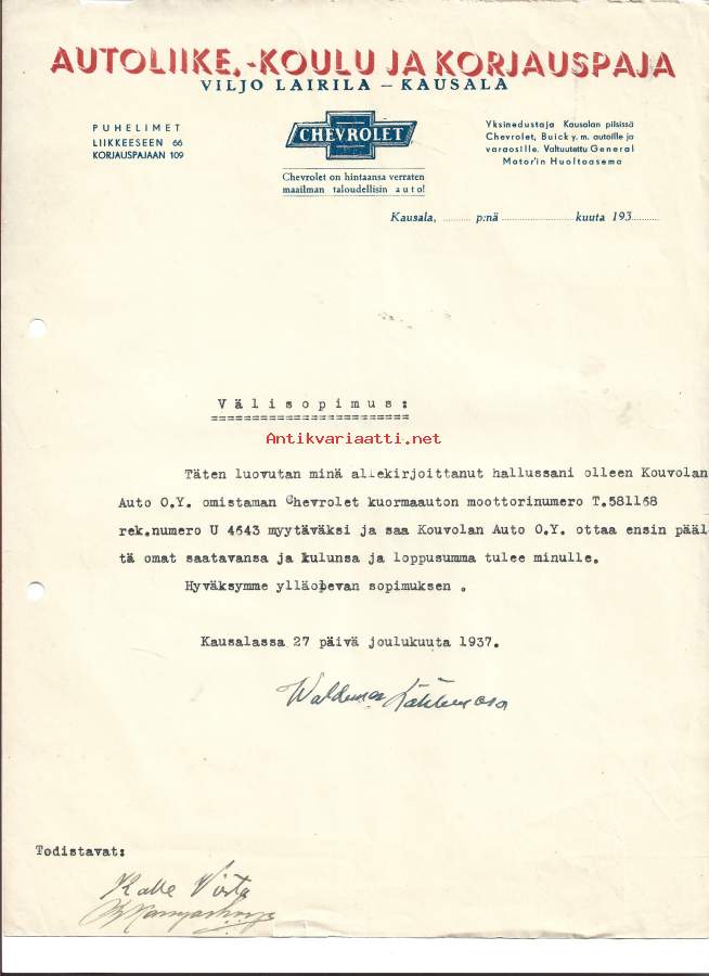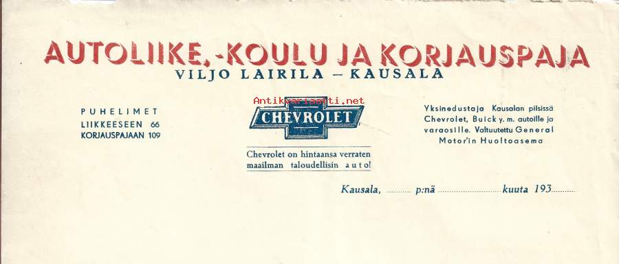 Autoliike, -koulu ja korjauspaja Viljo Lairila Kausala 1937 firmalomake