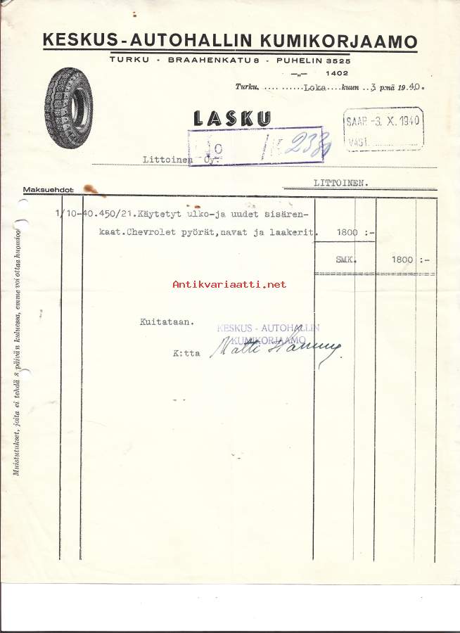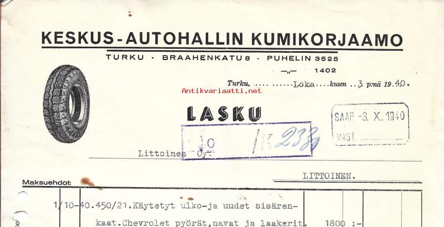 Keskus-Autohallin Kumikorjaamo Turku 1940 firmalomake