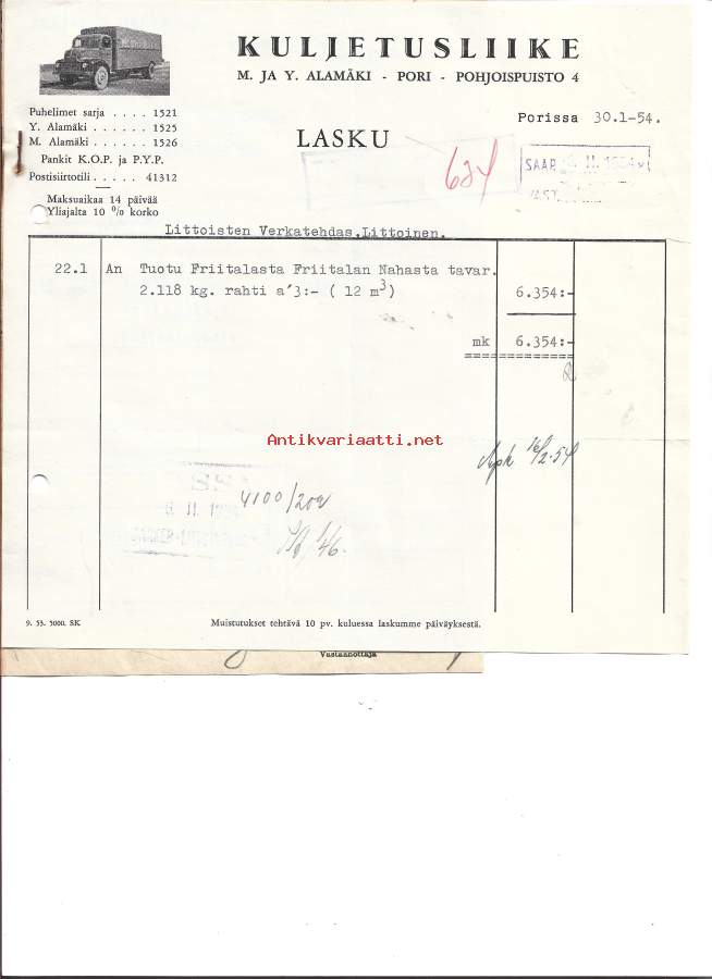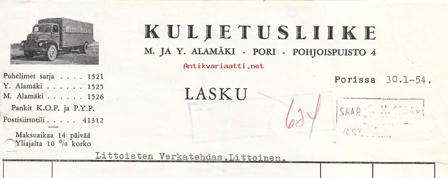 Kuljetusliike M ja Y Alamäki Pori 1954 - firmalomake