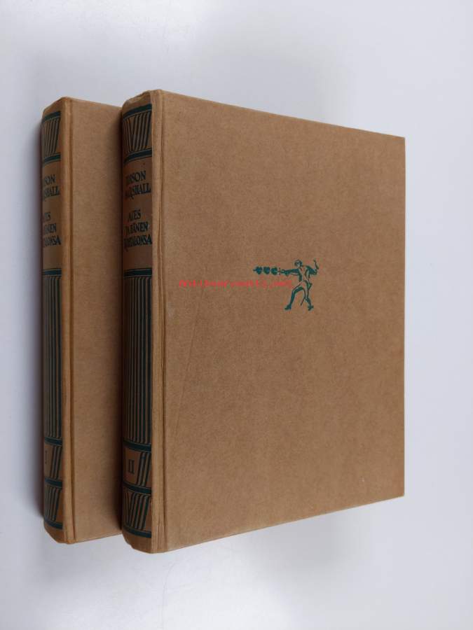 Tyydyttävä. Hieman kulumaa kansissa, selkämyksessä hieman vinoutta. toisen kirjan kansien ja lehtien yläreunassa jonkin verran läikkää ; toisen kirjan kulmissa hieman kolhua