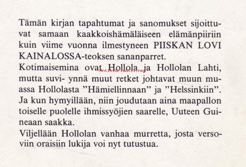 Viljellään Hollolan vanhaa murretta, joista versoviin oraisiin lukija voi nyt tutustua. Kirja tarjoaa väläyksen vanhaan hollolalaiseen ja lahtelaiseen mentaliteettiin ja puheenparsiin.